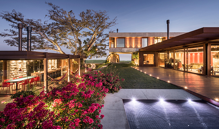 A Casa da Figueira foi desenhada a partir de uma arquitetura linear e quase brutalista, encontrando sua essência na pureza dos elementos construtivos. “A maior parte das texturas externas é plana e simples, como o aço corten e concreto. Nesse cenário, as grandes pedras trazem equilíbrio e balanço ao conjunto arquitetônico”, comenta Ingrid Stemmer, do escritório Stemmer Rodrigues Arquitetura.